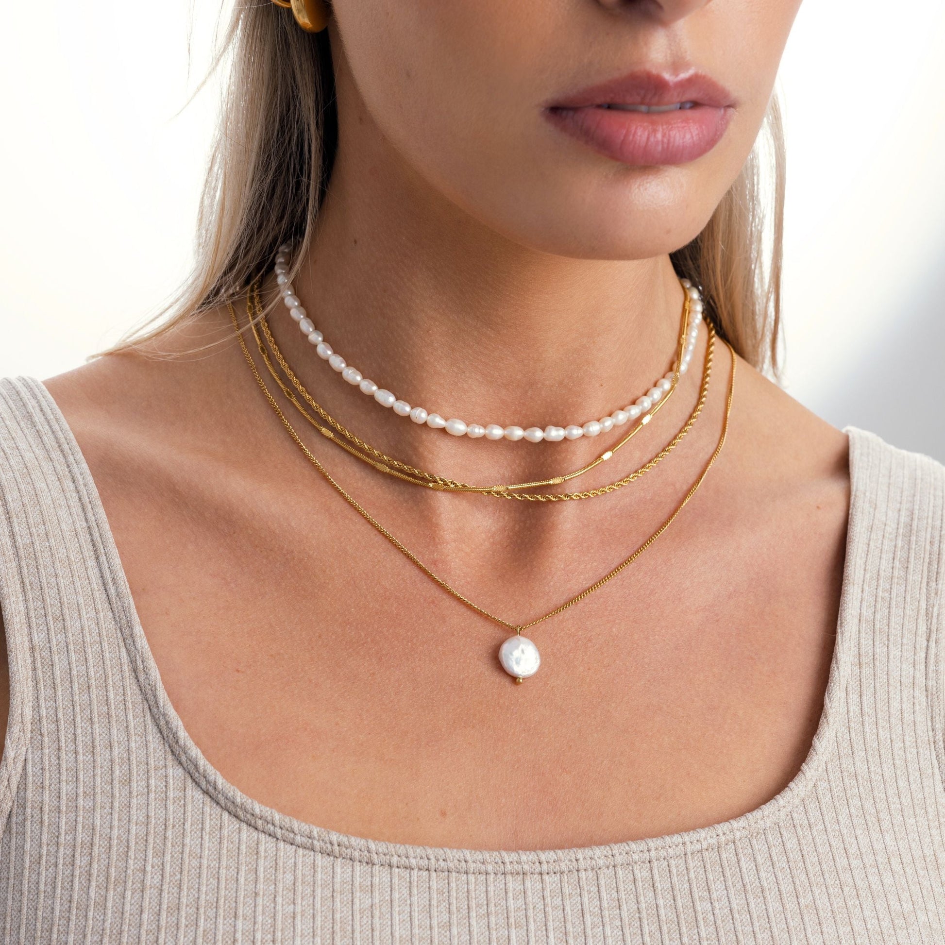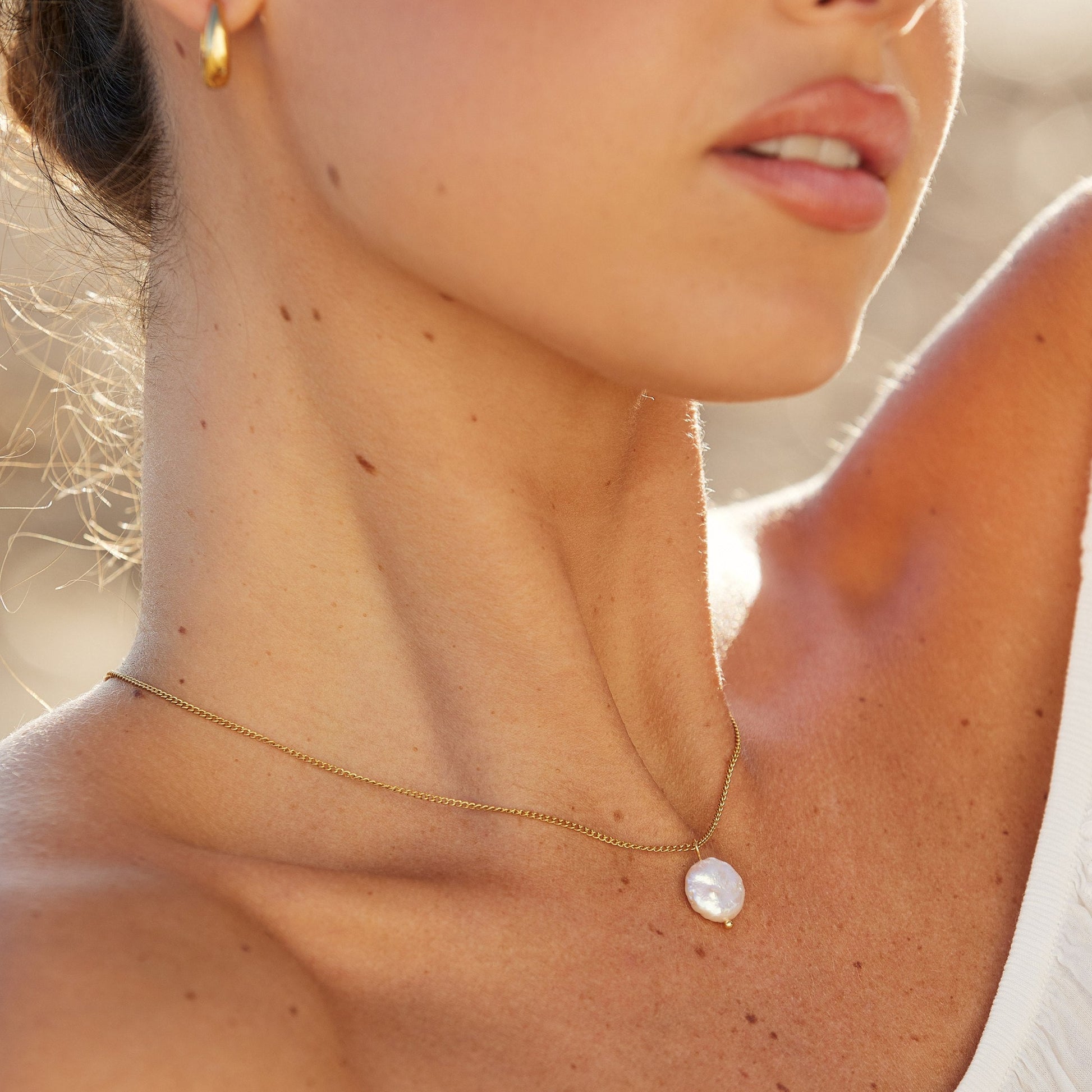 Discover our elegant Coin Pearl Necklace in 18k gold-plated stainless steel. This gold-plated women’s necklace with a natural freshwater pearl adds a refined touch to any outfit — a stylish and thoughtful gift idea as well.